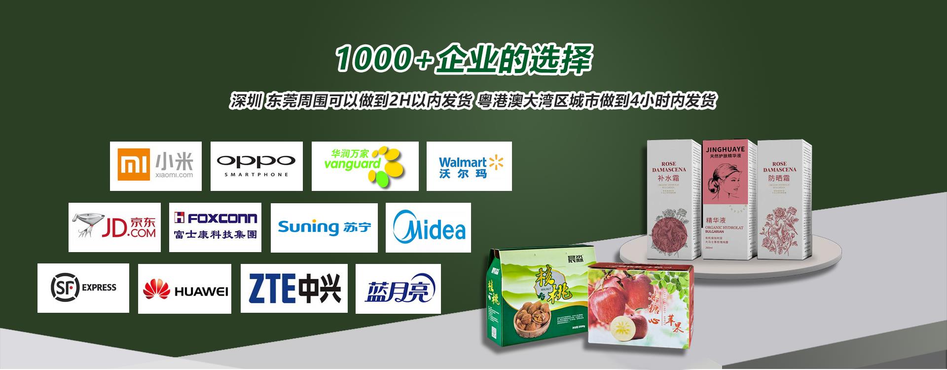 主要产品为PE、PO、PP;纸箱、啤盒、纸卡(彩盒,不干胶)、快递纸箱、重型纸箱、水果包装纸箱、重型纸箱、电子品纸箱、纸箱定制、飞机盒定制等包装产品。业务范围有深圳宝安、东莞常平、虎门、黄江、广州、惠州等地。